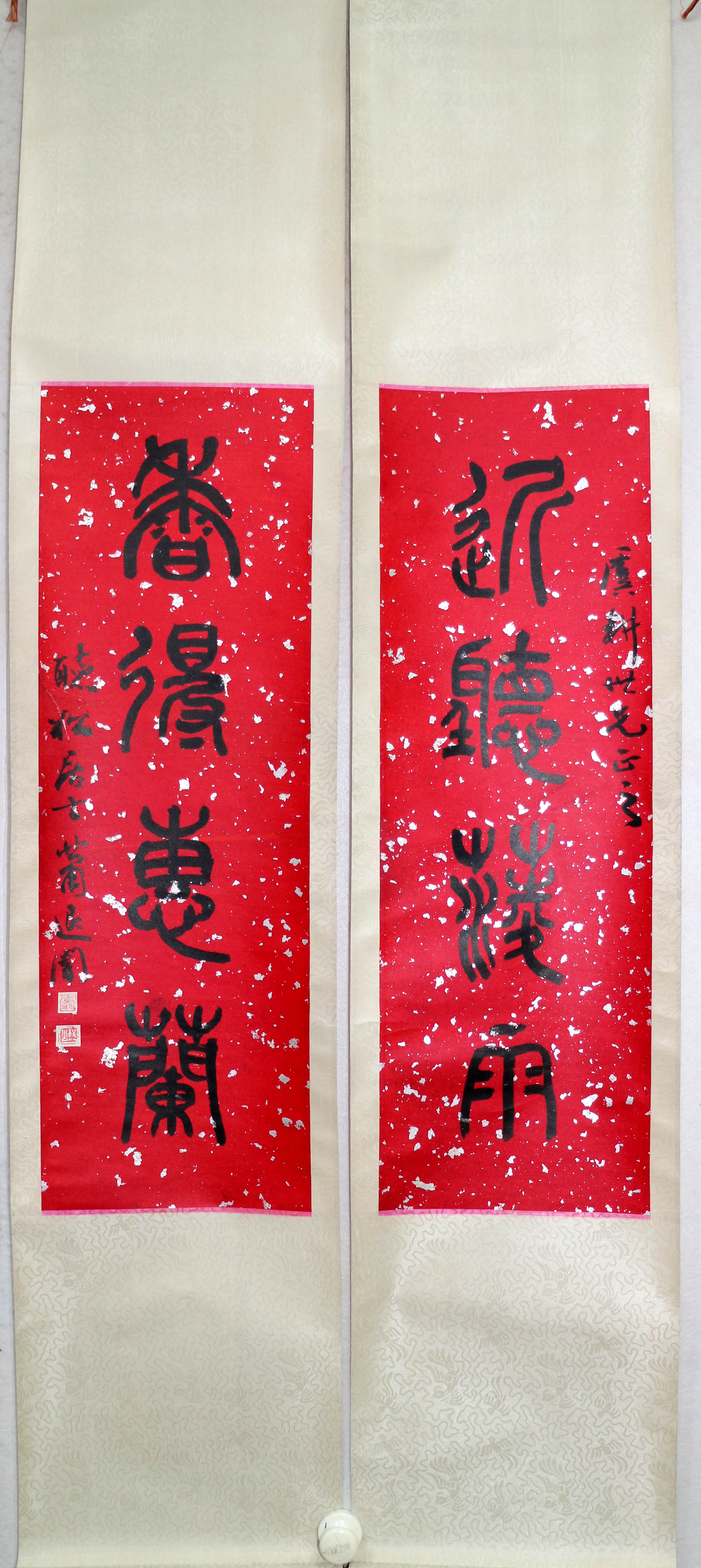 萧退闇,名蜕,字中孚,以退庵名世,别号很多,江苏常熟人。真草隶篆行五体皆工,尤以篆书名扬大江南北。自许甚高,以为篆书成就在前辈名家吴昌硕等人之上。初学邓石如,以后“上窥周、秦、汉代金石遗文,能融大小二篆为一”,篆字基本是用圆笔,笔法较简单,结构也少变化。他对篆书,有自己独到的体会:“篆书贵圆转自如,贵柔中有刚,贵结构紧凑。必须写得方,写得扁,方是好手;吴大微写得是方了,可是不够圆转,不够流丽;杨沂孙呢,又嫌圆而无骨,结构松驰;吴昌硕则刚有余而柔不足,尤其他那种缩项耸肩的样子实在太怪了”萧退庵自己的篆书确实克服了这些人的不足。他化传统的长篆为方篆,但方之后尚能保持圆劲的用笔与体势,结字特好,正是所谓疏可走马、密不容针。萧退庵另一个叫人称道的地方是,他主张书贵自然,以造作为书家大忌。这一精神明显地体现在他的行草书中。